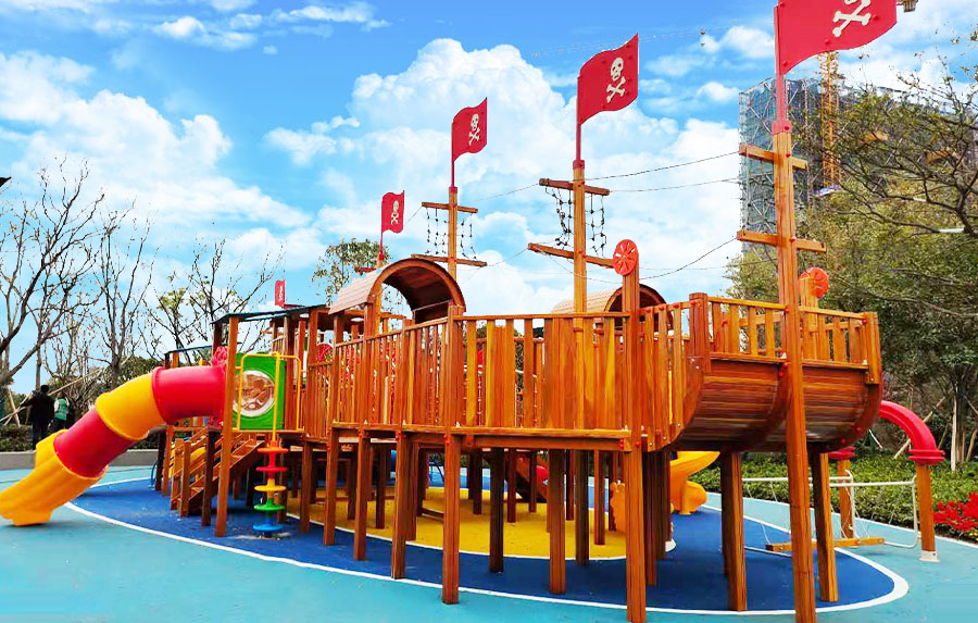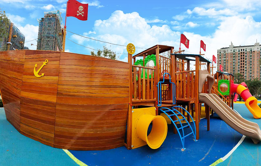非标木制滑梯组合案例采用海盗船的设计主体为原型设计,增加了大型滑梯组合以及攀爬、钻洞等功能,整个主体设备采用木制结构,乐鱼leyu.com游乐生产的木制游乐设备具有颜色艳丽、外观漂亮,实用性强、经久耐用、安全性能好等特点,为小朋友的玩耍提供了一个很好的场所。