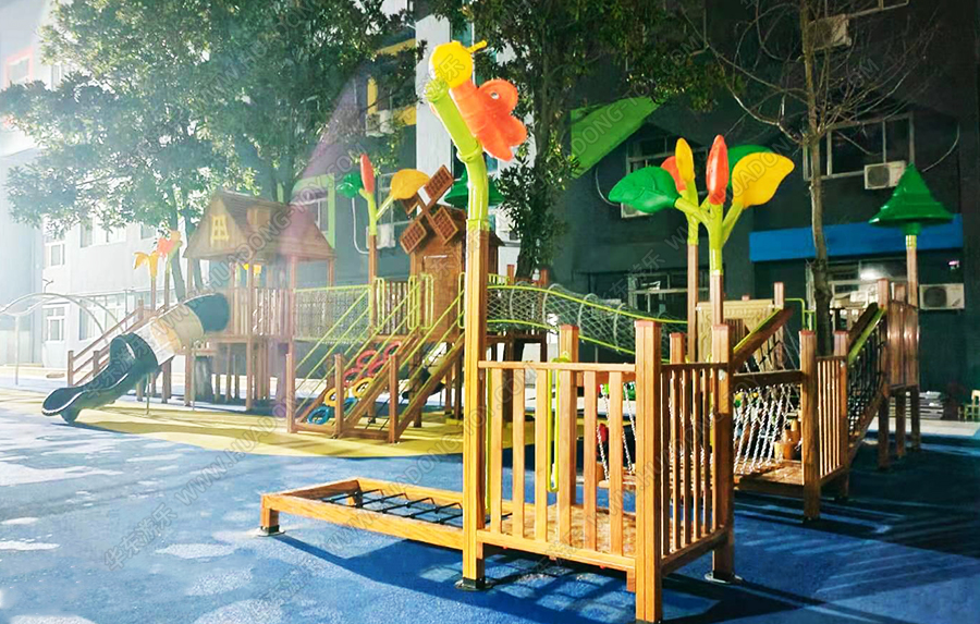 江苏省泰兴市育红幼儿园城西分校是经教育部批准的优秀幼儿园,该幼儿园此次采用的是乐鱼leyu.com游乐生产的木制系列产品,具有爬网、攀爬、滑梯、脚踏水车、传声筒、钻洞等游乐设施。