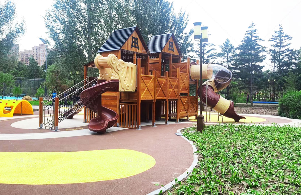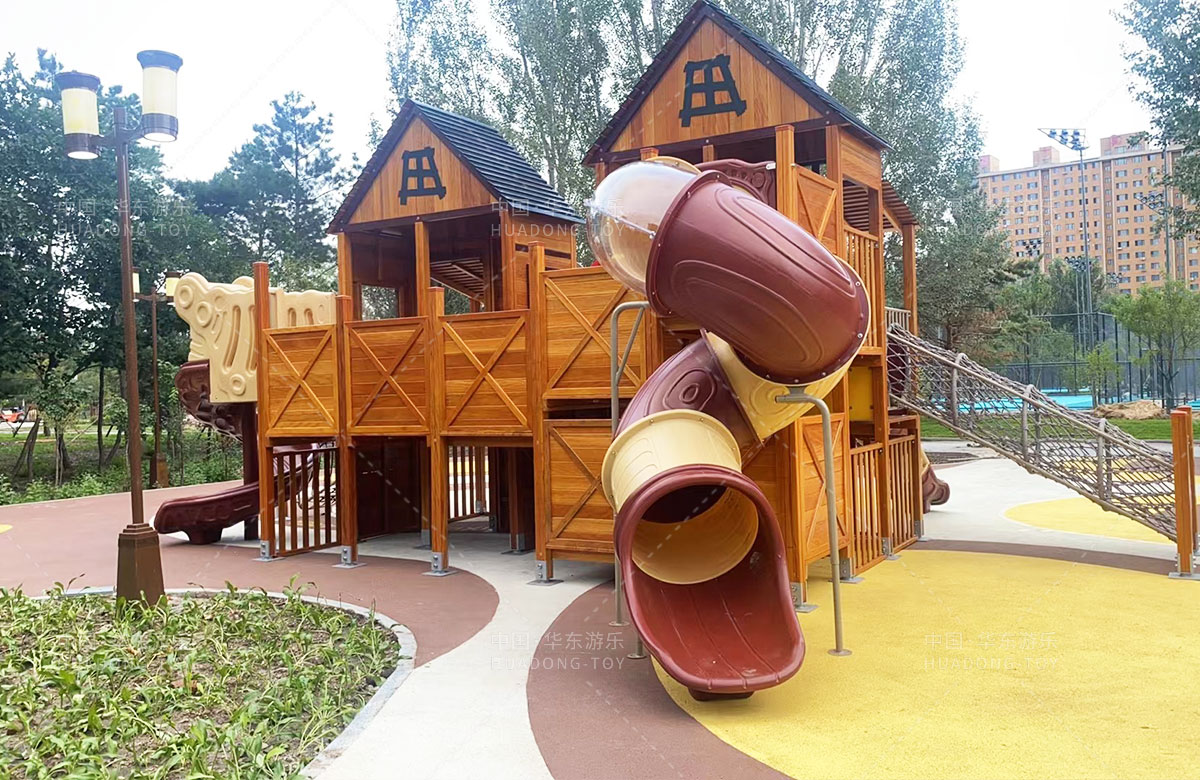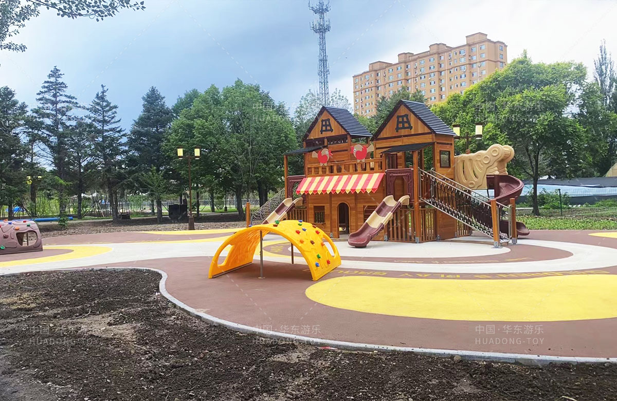 吉林省白城市洮北区兵器城小区是一个综合类型的居民小区,该小区设置了各种类型的 游乐设施,为了更好的为人民提供一个休闲娱乐的场所,此次选用的是乐鱼leyu.com游乐自主研发和设计的木质小屋系列的组合滑梯,除此之外还设置了孩子们喜欢的各种攀爬游乐设备。